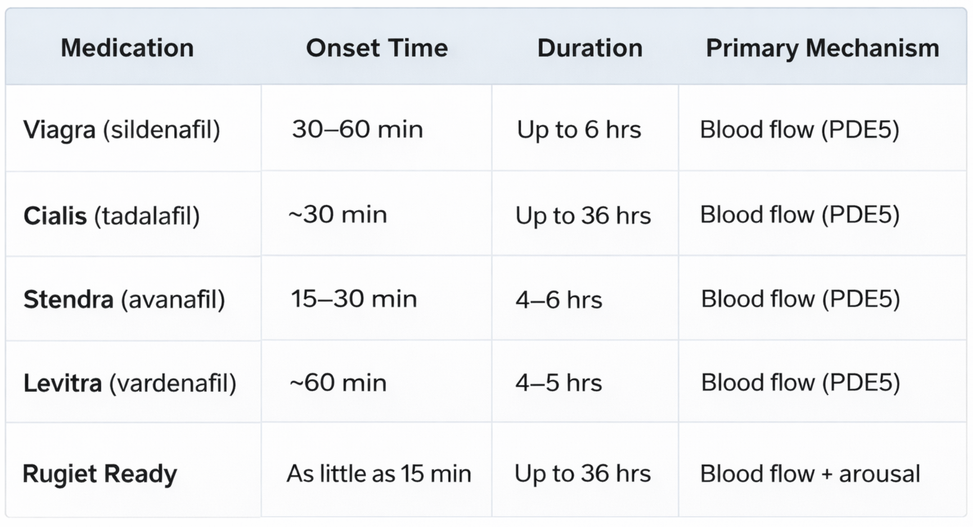 Most ED medications take 15–60 minutes to work. Avanafil (Stendra) and Rugiet Ready can work in as little as 15 minutes, while sildenafil (Viagra) typically takes 30–60 minutes. Tadalafil (Cialis) takes about 30 minutes but lasts much longer than other options.
